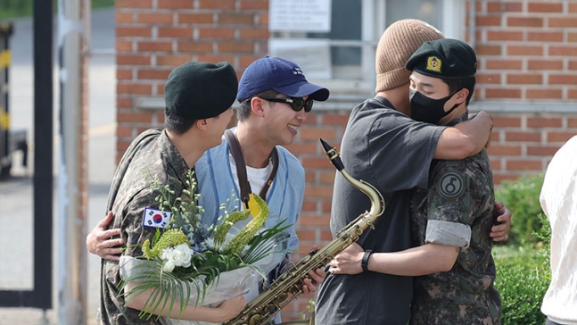 특히, 군악대에서 복무 중인 RM은 직접 색소폰을 연주하며 히트곡 '다이너마이트'(Dynamite)를 연주하며 진을 맞이했다.